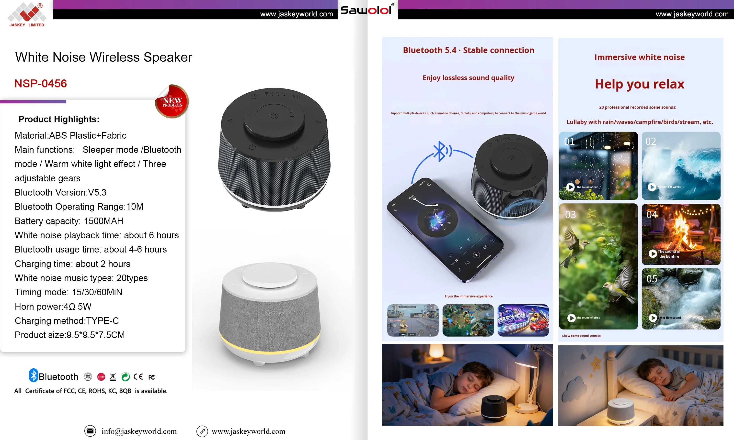 这款一体化设备由 1500MAH 可充电电池供电,在持久使用与快速充电之间取得了平衡:享受 4-6 小时的蓝牙音乐播放和快速充电。 Type-C 充电 2 小时 让它恢复到满功率——没有杂乱的电缆或缓慢的充电效率。我们还添加了一个方便的 15/30/60Min定时模式,让用户设置白噪声和光的自动关闭,提高最终客户的可用性和能源效率。每个细节的设计都考虑到消费者的满意度,确保产品不仅能畅销,还能为您的零售业务赢得积极评价和重复购买。![]()