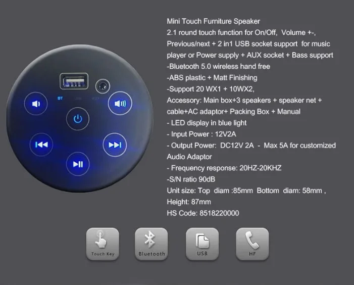 China Mini Touch Furniture Speakers.In the booming global wireless audio market, which is projected to reach USD 5.90 billion by 2030 with a steady CAGR of 2.5%, finding high-quality, multi-functional audio products that cater to diverse consumer demands has become the key to success for electronics retailers, wholesalers, and electronic gift suppliers. Established in 2008, we are a professional integrated company specializing in the design, R&D, and sales of customized audio speakers and headphones, with a solid presence in Europe, Japan, South Korea, and Australia. Today, we are proud to present our star product — the Mini Touch Furniture Speaker, a game-changer tailored to unlock new opportunities in Europe, America, Japan, South Korea, as well as emerging developed markets in South America, Africa, and India.![]()
