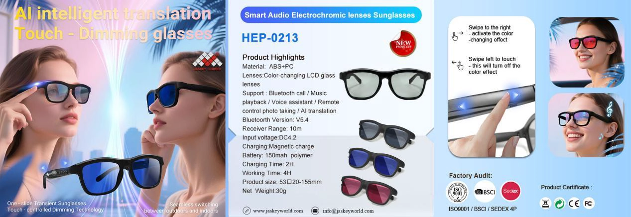 With 17 years of specialized experience in audio product R&D and manufacturing, we are proud to introduce our latest flagship project: the HEP-0213 Smart Audio Electrochromic Sunglasses.