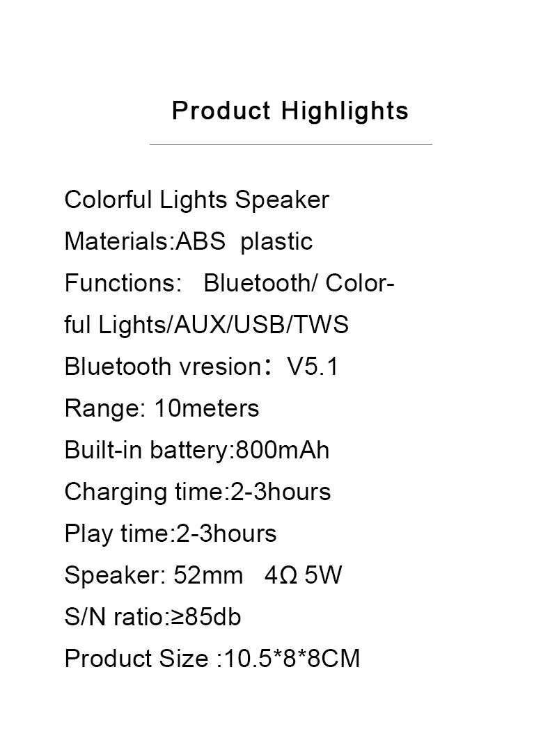 Functions:Bluetooth/ Colorful Lights/AUX/USB/TWS