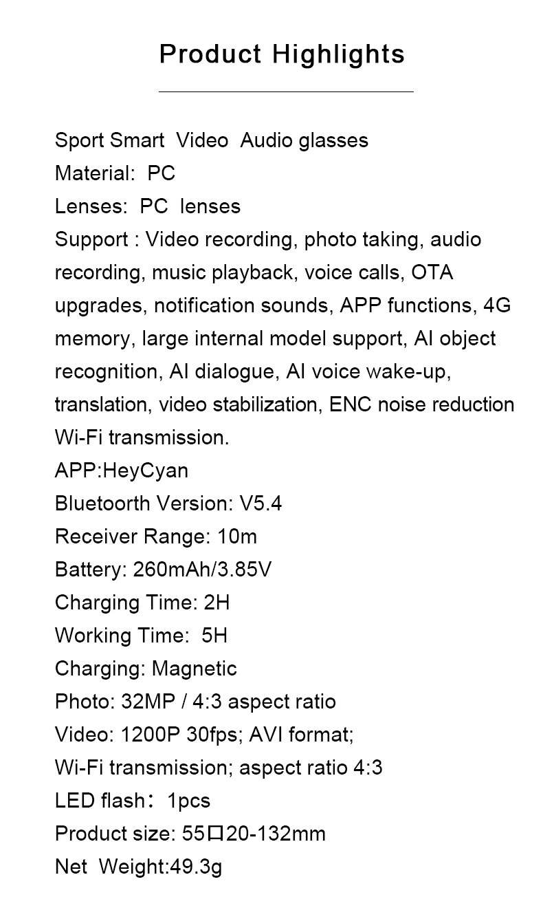 Support: Video recording, photo taking,audio recording, music playback, voicecalls, OTA upgrades, notification sounds,APP functions, 4G memory, large internalmodel support, Al object recognition, Aldialogue, Al voice wake-up, translation, video stabilization, ENC noise reduction, Wi-Fi transmission.