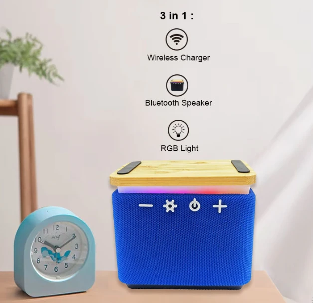 Alto-falante carregador sem fio da China com luz RGB.Este dispositivo inovador é mais do que apenas um alto-falante – é um acessório de estilo de vida que atende às diversas necessidades dos consumidores modernos. Fabricado a partir de uma mistura premium de plástico ABS, bambu e tecido, possui uma construção elegante e durável que combina calor natural com design contemporâneo. Medindo apenas 9,86*6,7*8,7cm, é compacto o suficiente para escrivaninhas, prateleiras ou mesas de cabeceira, mas poderoso o suficiente para oferecer desempenho de áudio excepcional.