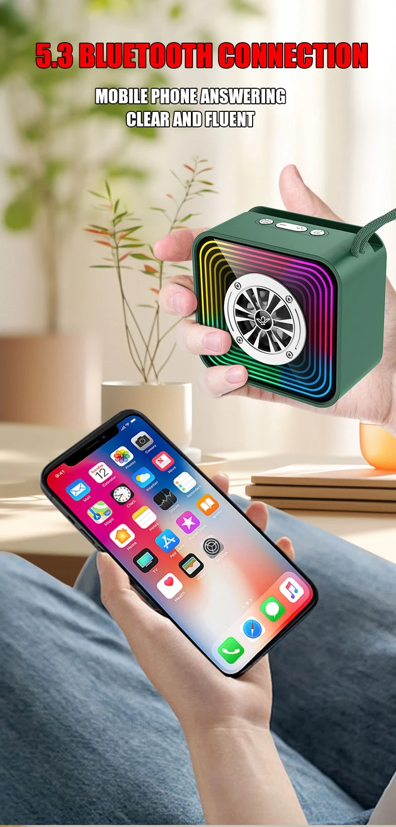 Çin yapımı RGB Işıklı Bluetooth Mini Hoparlör (2008 ses firmasından): TF/USB/FM, telefon tutucusu, Bluetooth 5.3. 5W ses, 2-4 saat oynatma süresi, 11,2×6,1×10,5CM ABS—çok yönlü, çekici ekipmanlara ihtiyaç duyan perakendeciler için mükemmel.