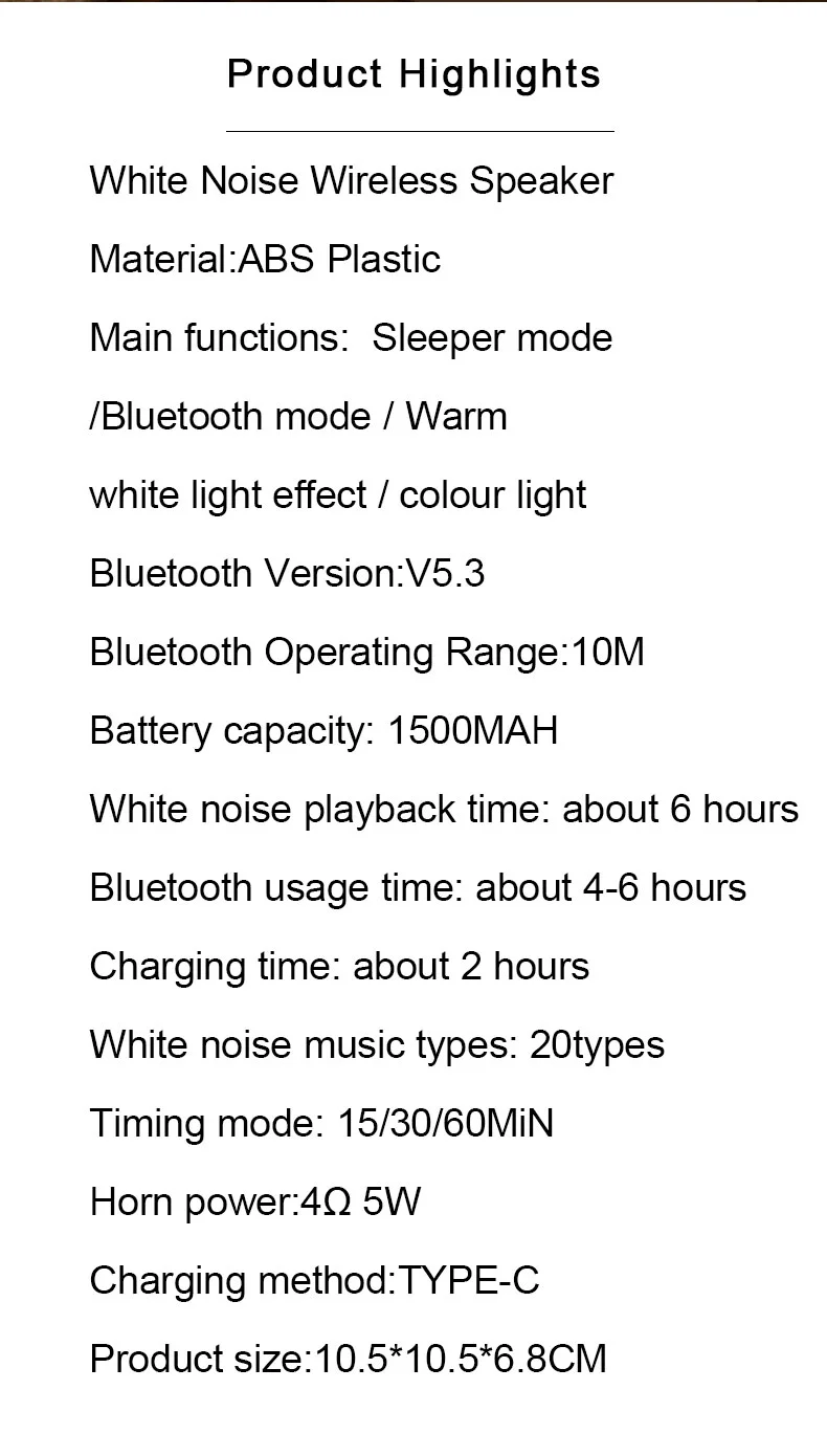 Các chức năng chính: Chế độ ngủ / Chế độ Bluetooth / Hiệu ứng ánh sáng trắng ấm / đèn màu Phiên bản Bluetooth: V5.3